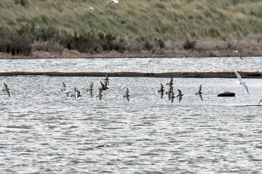 A flock of Turnstone coming in to land on an island in the Tidal Marsh.