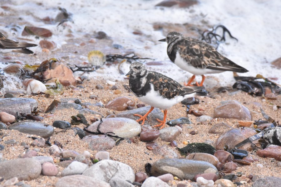 A pair of Turnstone (from a flock of about a dozen birds) wary of the incoming tide