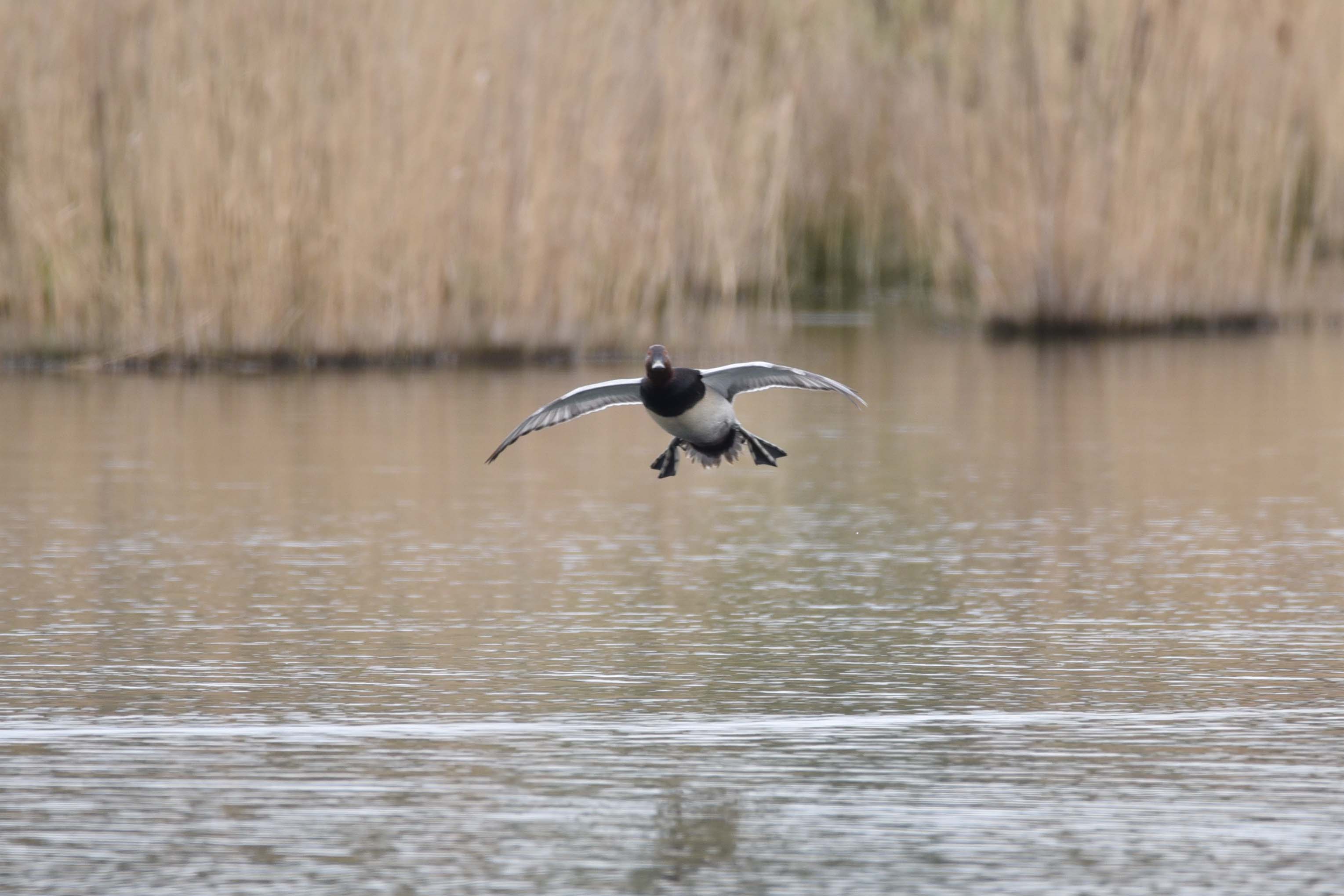 A Pochard on final approach at the Reedbed Hide.