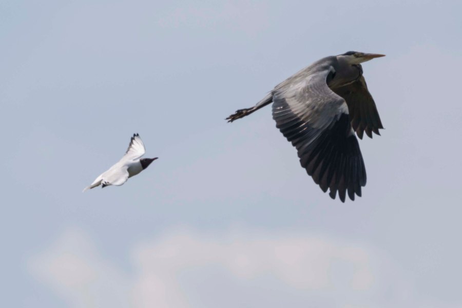 A Grey Heron being harries by a Black-Headed Gull