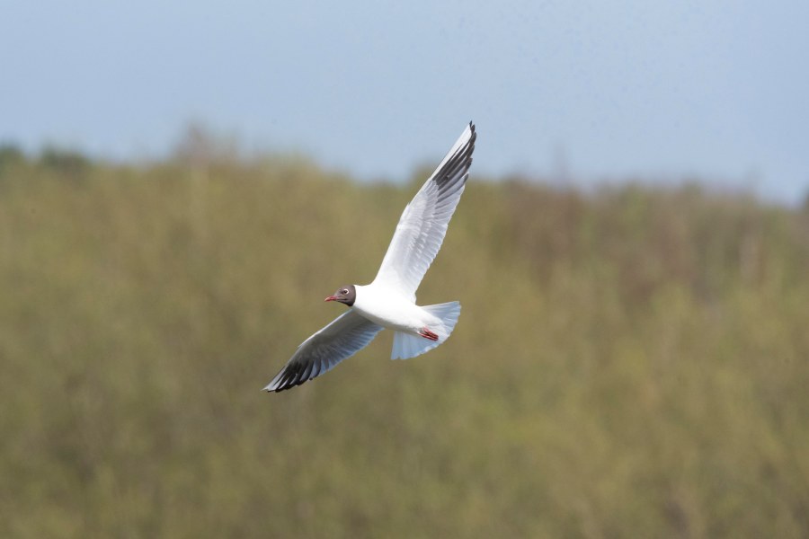 A Black Headed Gull flies over the Wader Scrape