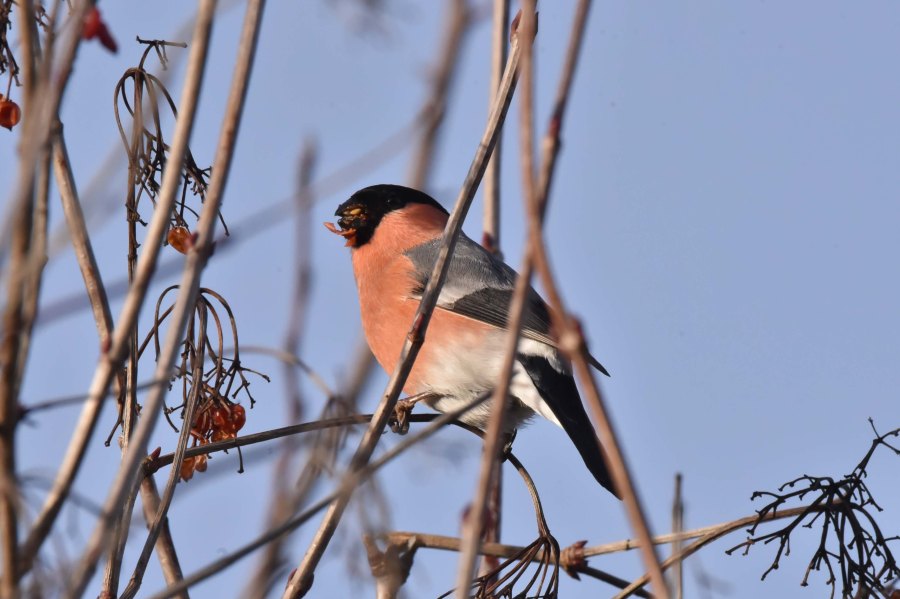 A lovely male Bullfinch feeding on Rowan berries