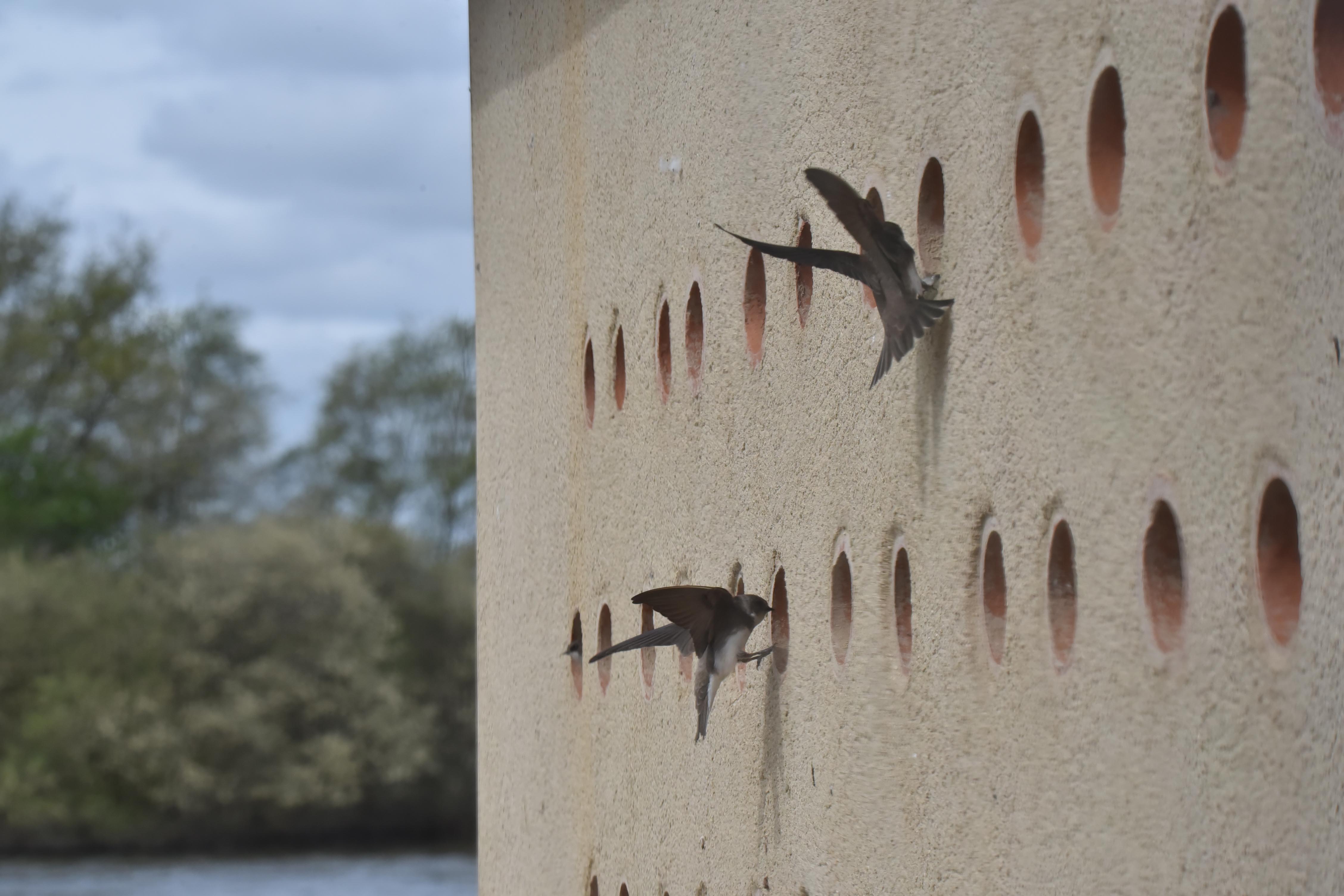 Sand Martins arriving with food for their young