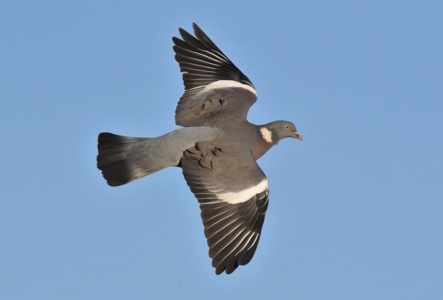 A beautiful Woodpigeon soars overhead near Xerox Hide
